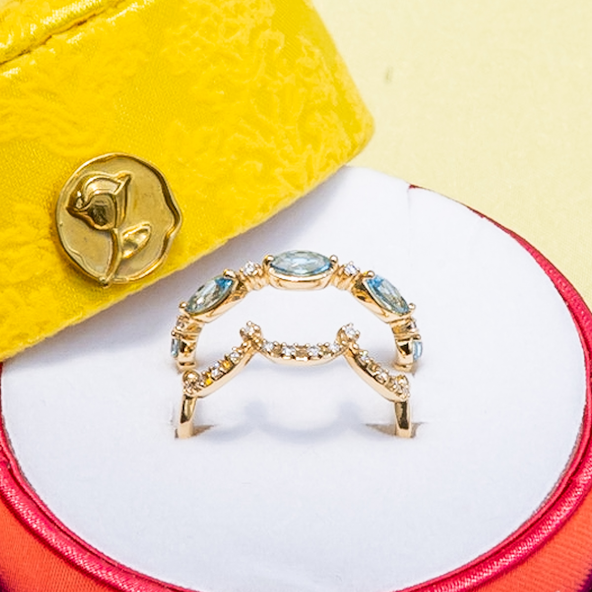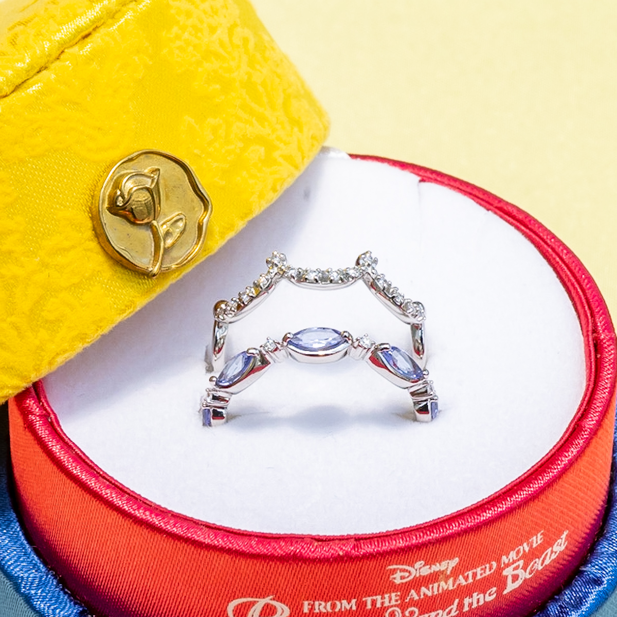 物語の象徴である魔法のバラや、「野獣」のタキシードの色をイメージしたリングと「ベル」が纏うドレスのドレープを思わせるダイヤモンドのリングの2本セット。