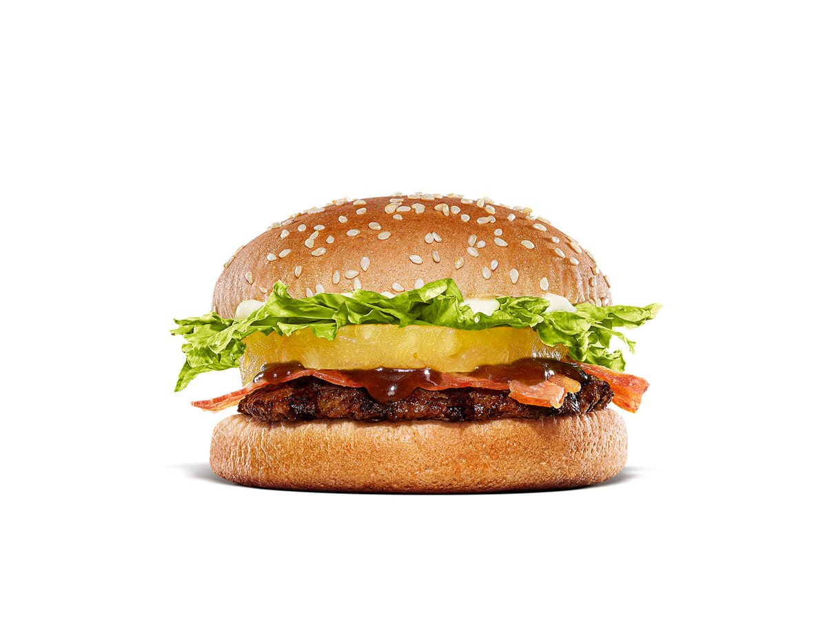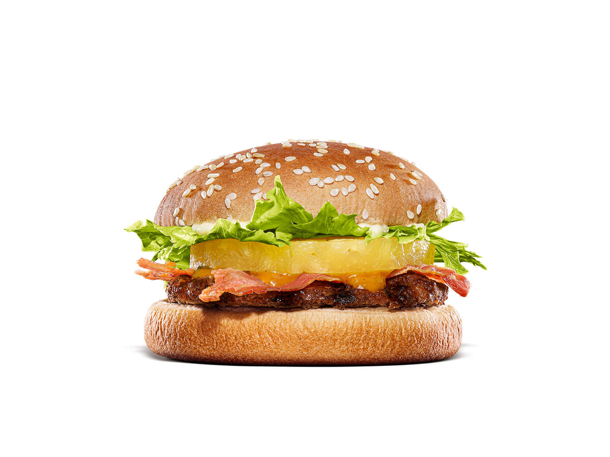 ジューシーな直火焼きの100%ビーフパティとスモーキーなベーコンに、パイナップルをあわせたハンバーガー。