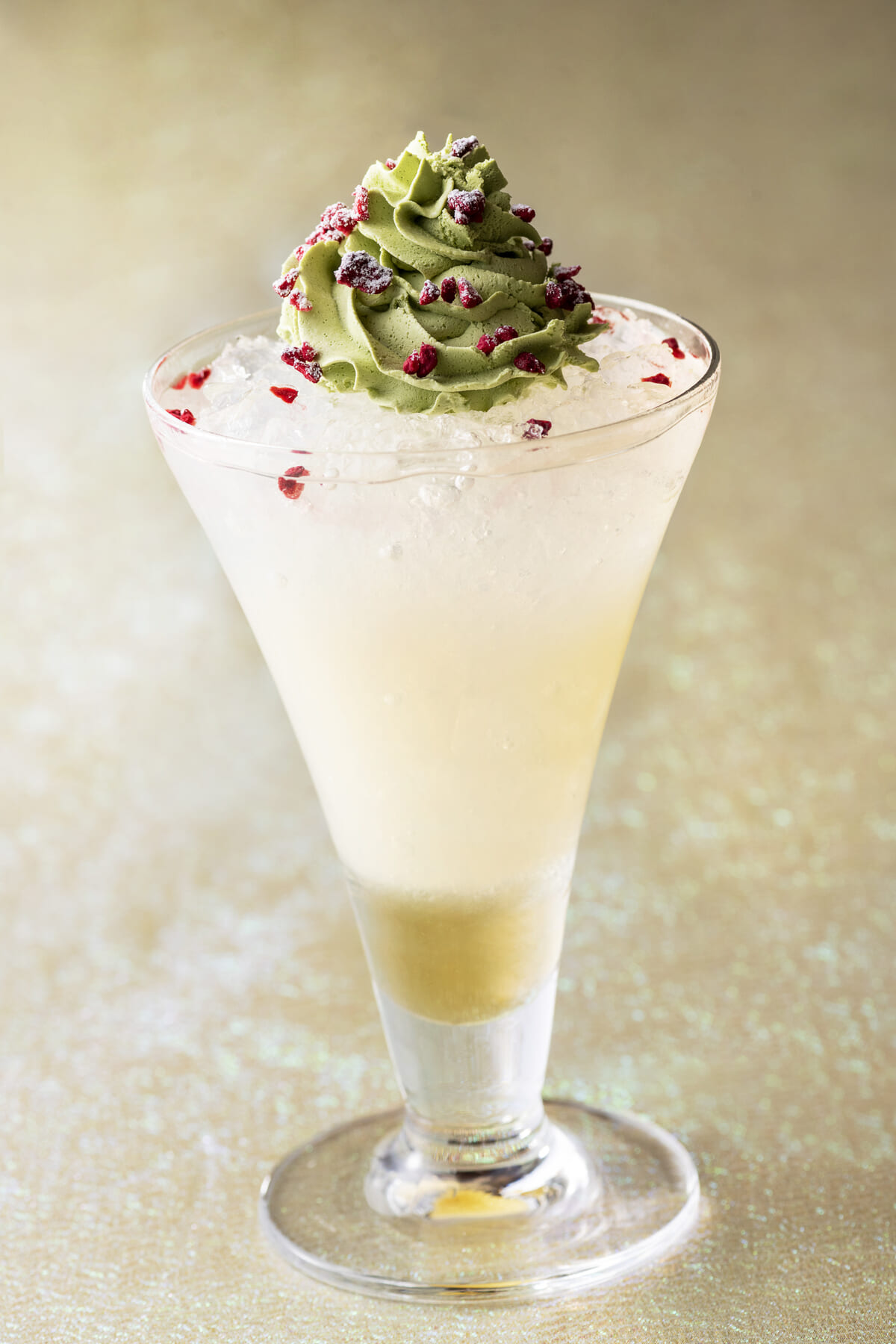 ドリンクの上には抹茶ホイップクリームを絞り、ドライフランボワーズとアイシングシュガーで、クリスマスツリーを表現。