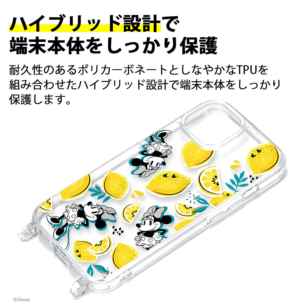 レモンとミニーのおしゃれなデザインも!PGA「ディズニー」iPhone15 ストラップホール付クリアハイブリッドケース