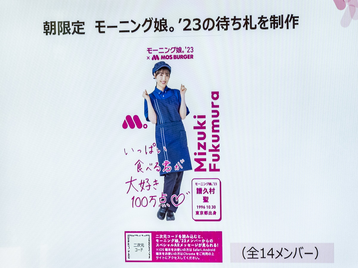 番号札記載の二次元バーコードを読み取るとモスバーガーのコスチュームを着た「モーニング娘。'23」のメンバーがARで出現するキャンペーン。