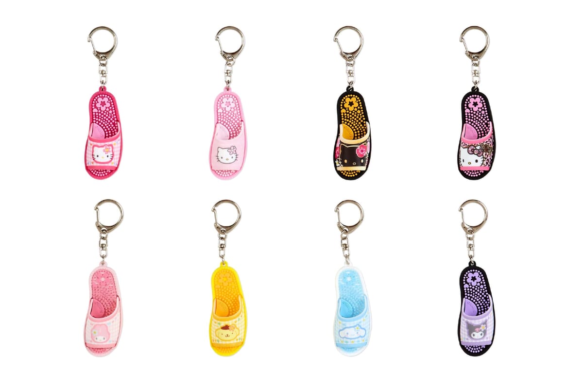 「ハローキティ」「マイメロディ」「ポムポムプリン」「シナモロール」「クロミ」のマスコットキーホルダー。
