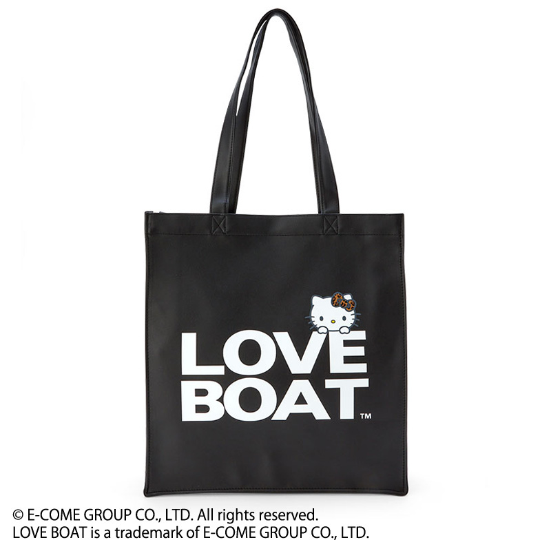 「ハローキティ」が「LOVE BOAT」のロゴからちょこんと顔を出しているデザインのトートバッグ。