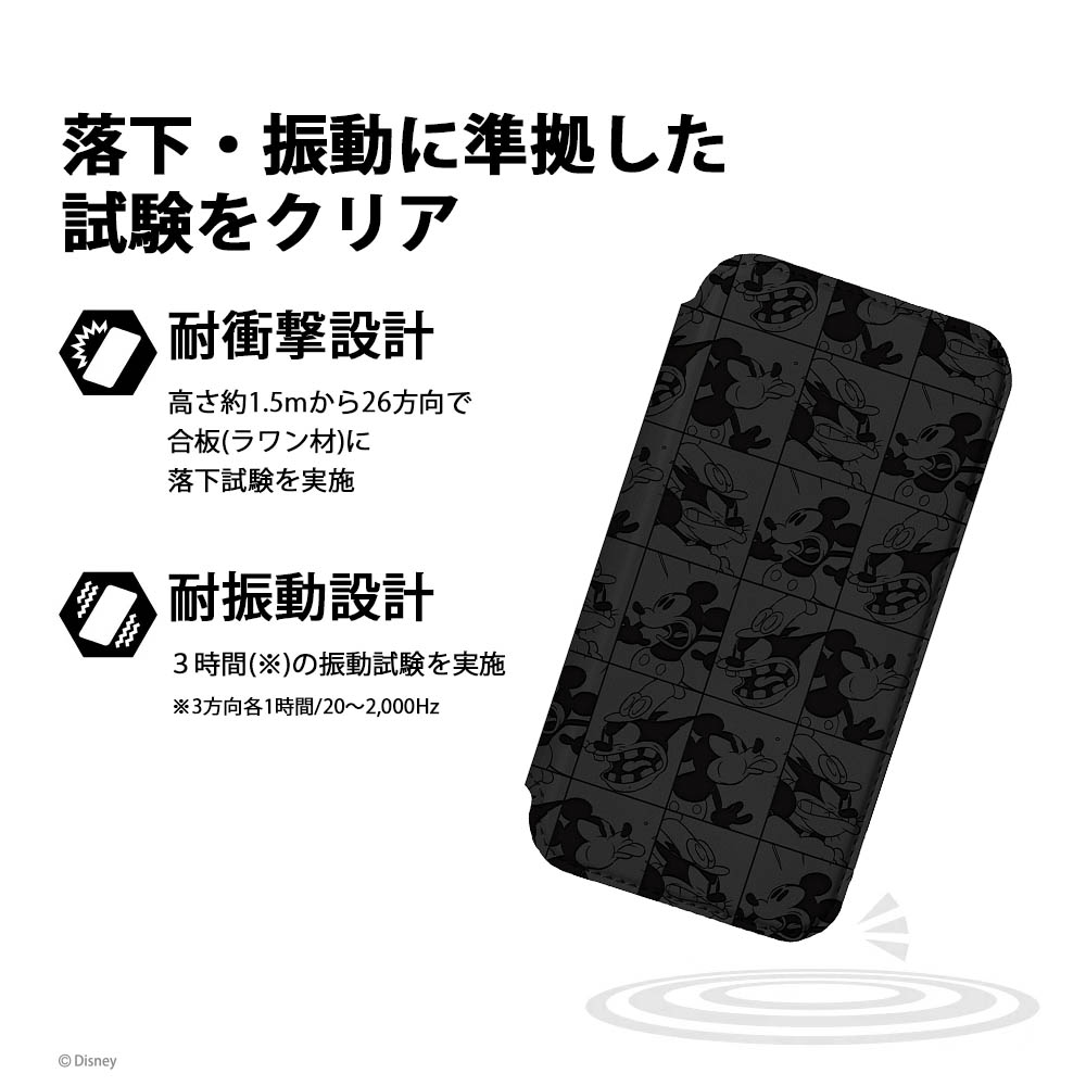 MIL 規格(MIL-STD-810G)の2項目、落下・振動に準拠した試験をクリアしたタフ設計の「iPhone15 手帳型フリップカバー」