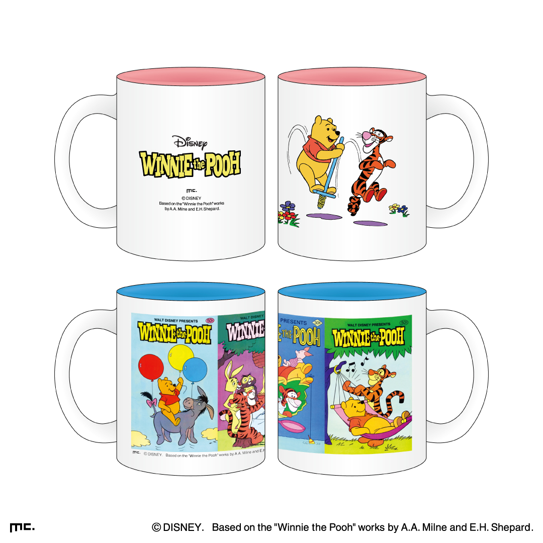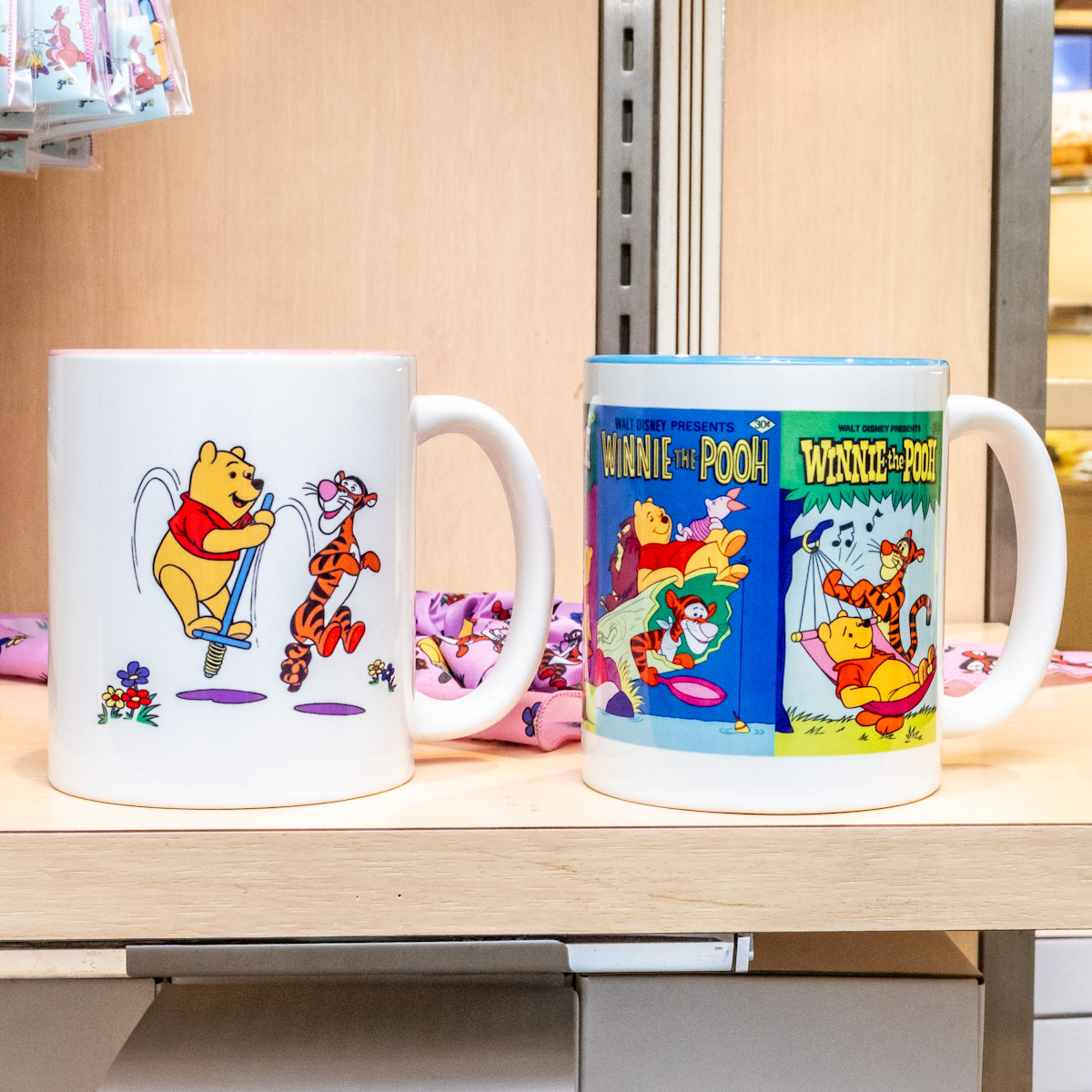 「ティガー」とホッピングで遊ぶ「くまのプーさん」デザインと、ポスターアート風デザインのマグカップ。