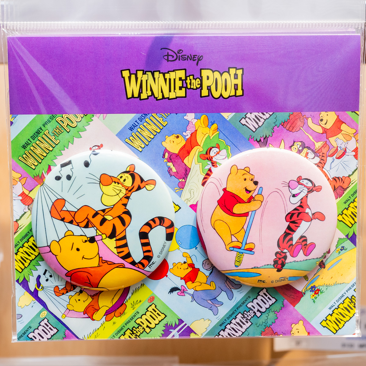 「くまのプーさん」と「ティガー」の場面を描いた缶バッジセット。