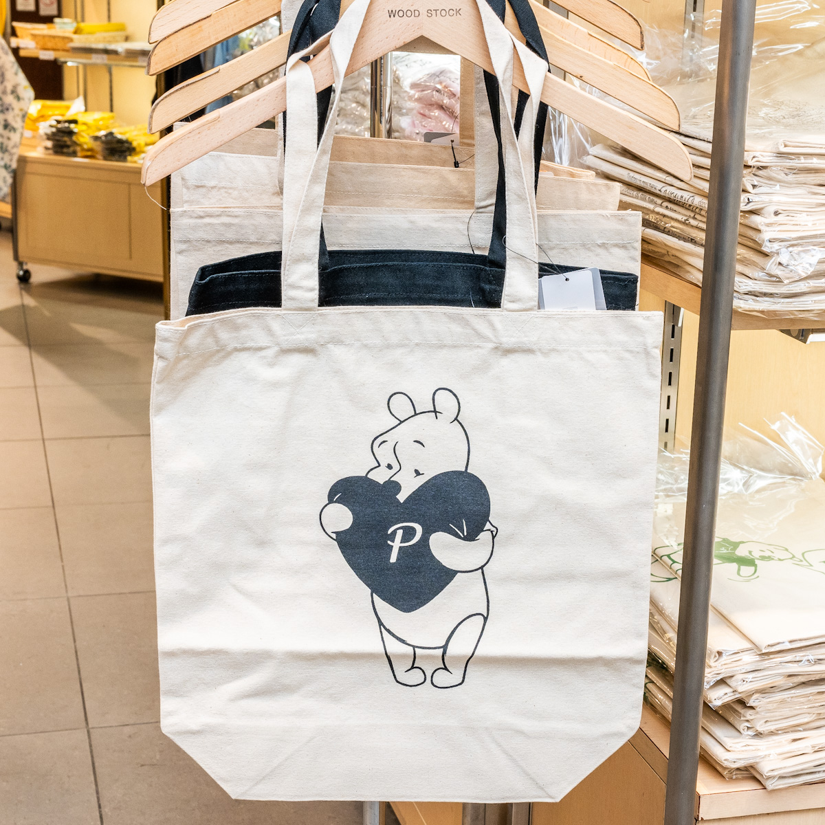 トートバッグは、「くまのプーさん」がハートを抱きしめている様子を描いています。
