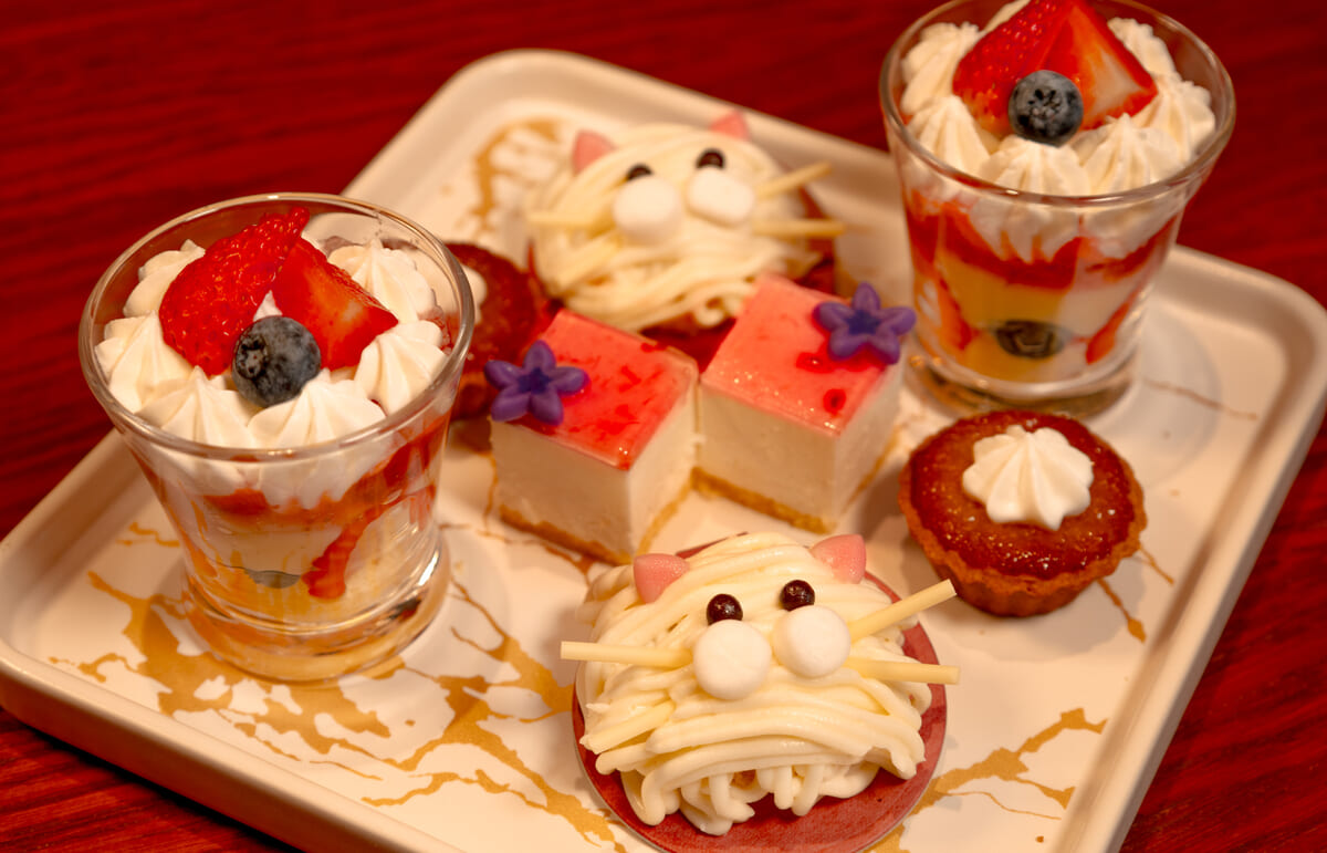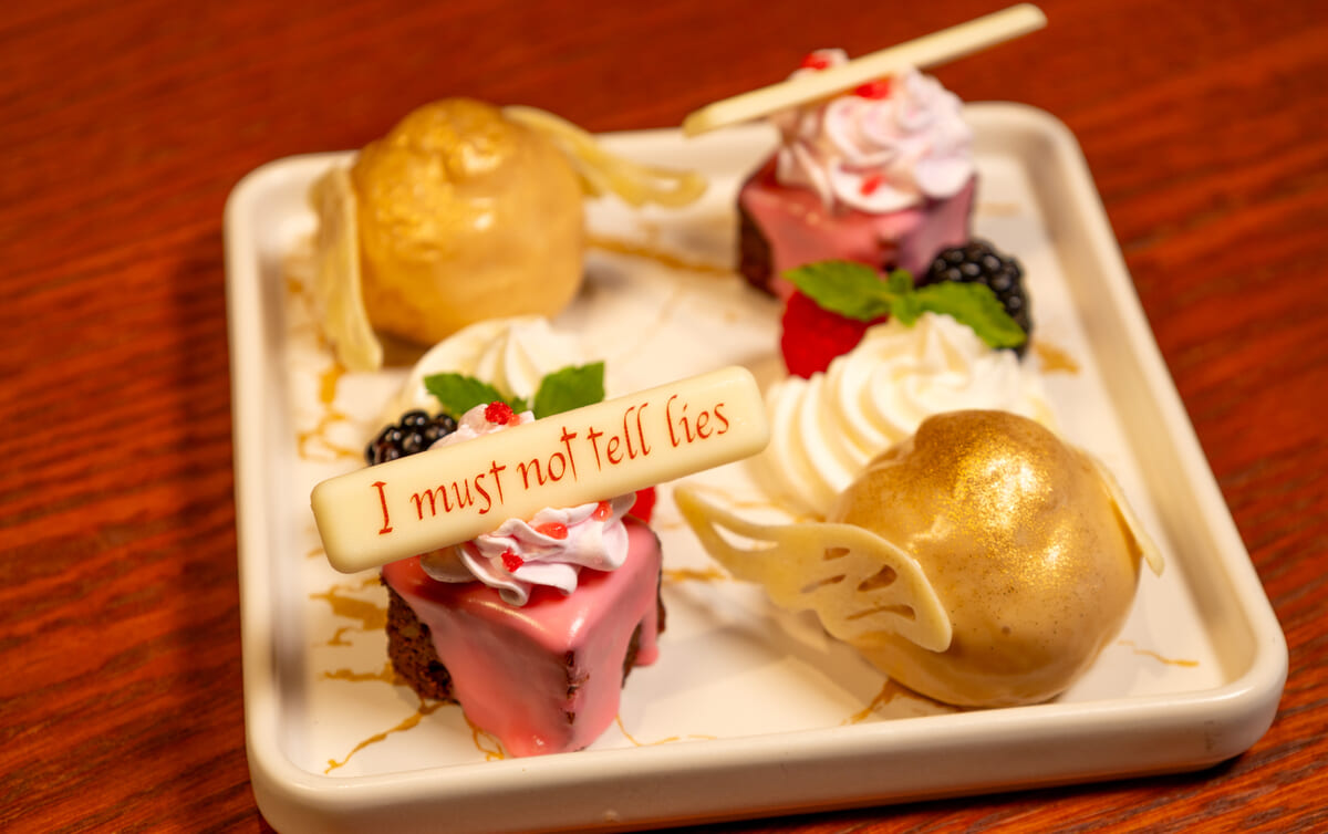 彼女が寵愛する動物、ネコを取り入れた「子猫のレアチーズモンブラン」や、「ハリー・ポッター」に罰則を与えたシーンでおなじみのフレーズ「I must not tell lies(僕はウソをついてはいけない)」と書かれたデコレーションがほどこされている「罰則ブラウニー」など、「ハリー・ポッター」好きにはたまらない、細かなこだわりの詰まったスイーツも味わうことができます。