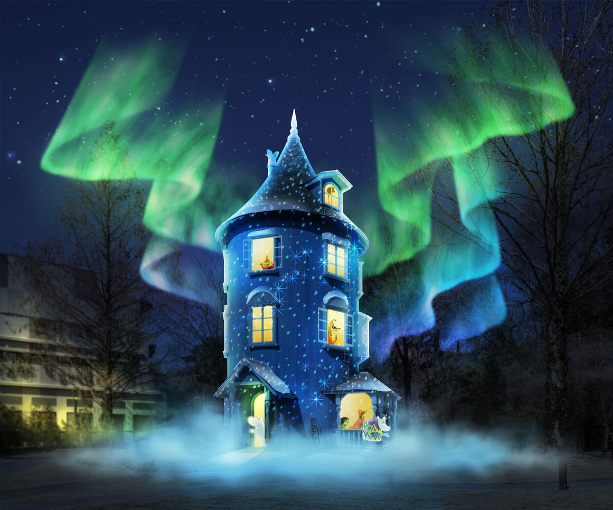 幻想的なオーロラと、ムーミン屋敷に映し出されるプロジェクションマッピング