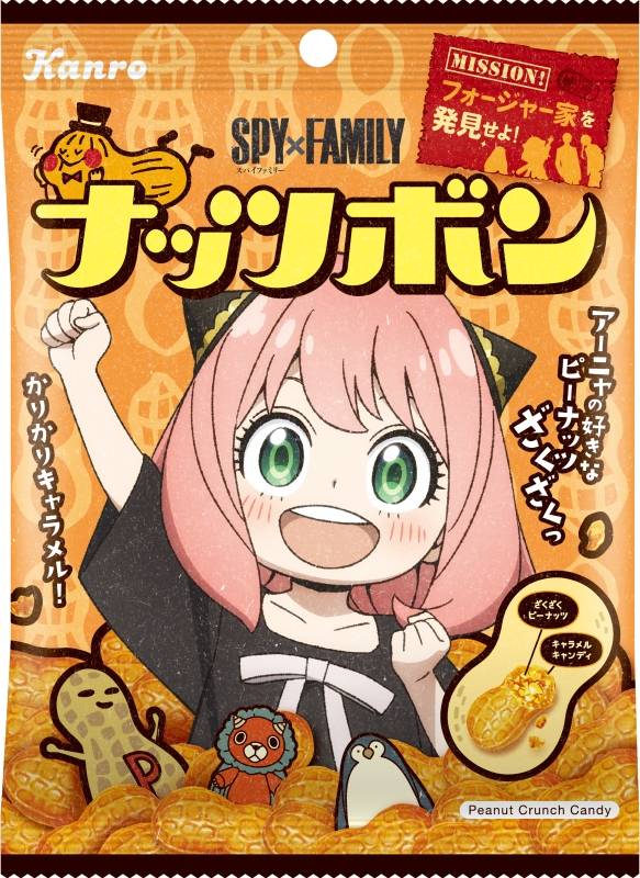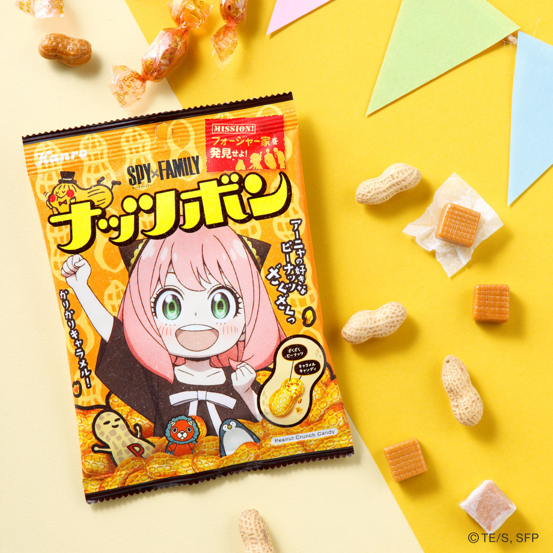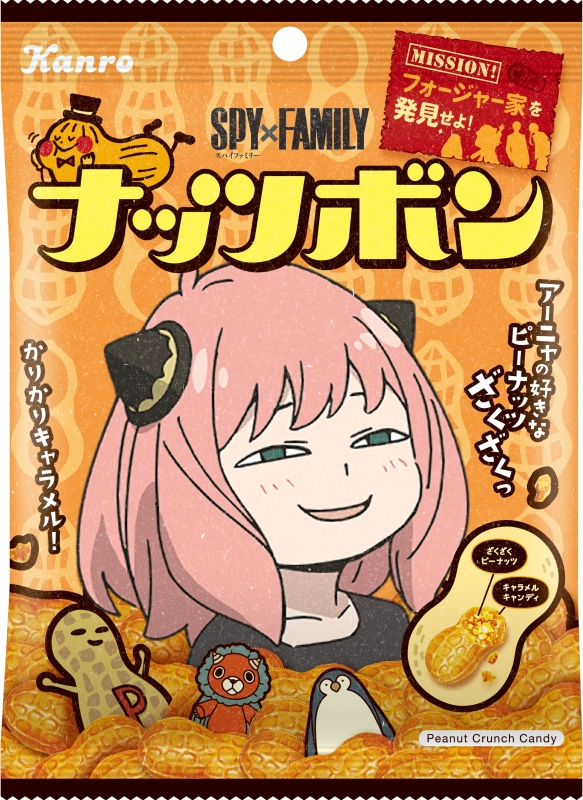 「アーニャ・フォージャー」デザインのパッケージで登場する、ザクザクピーナッツのクランチキャンディ。