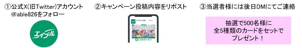 「エイブル」の公式X(旧Twitter)アカウントをフォローし、上記のキャンペーン投稿をリポストすると、抽選で500名に全5種類のカードをセットでプレゼント。