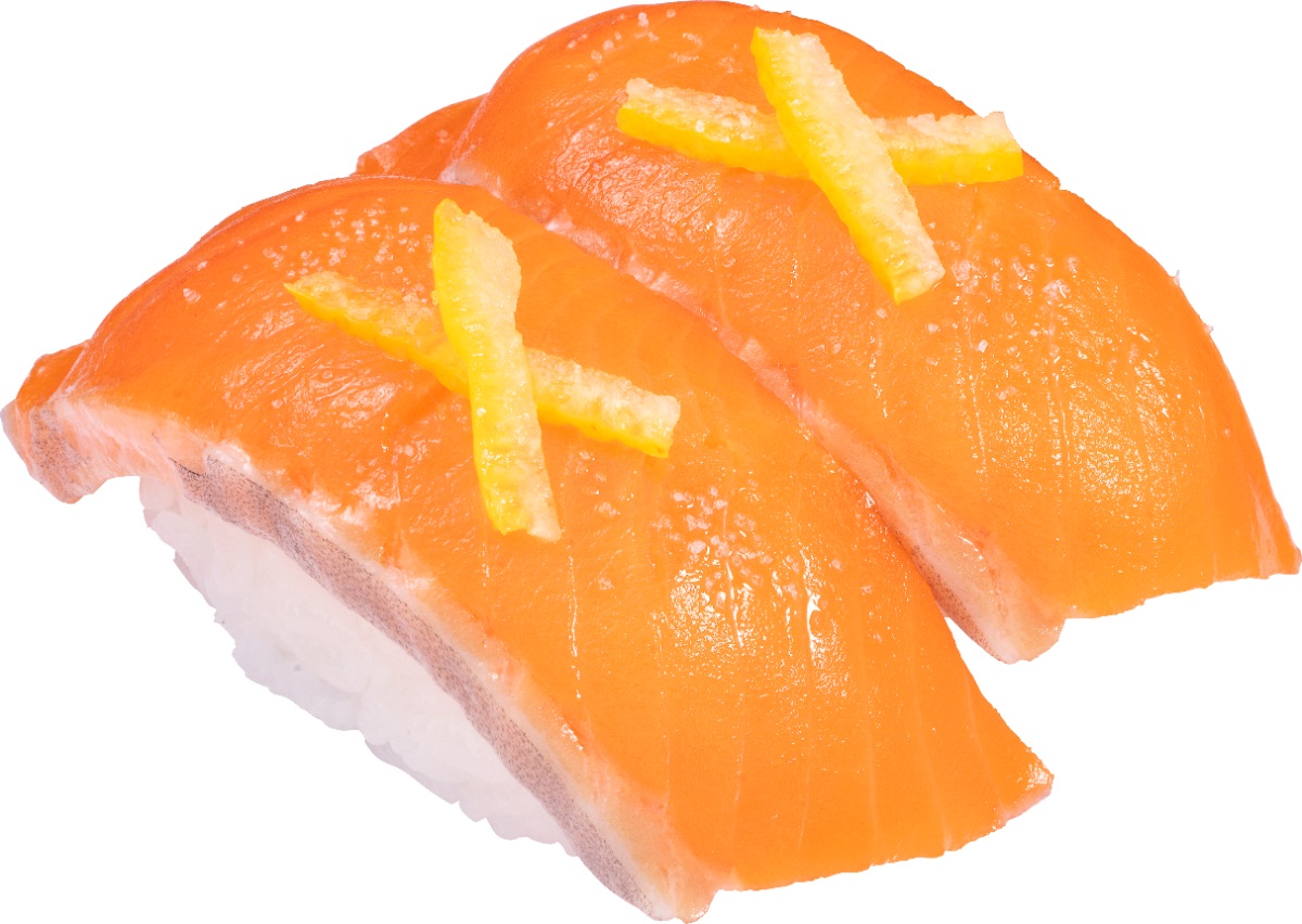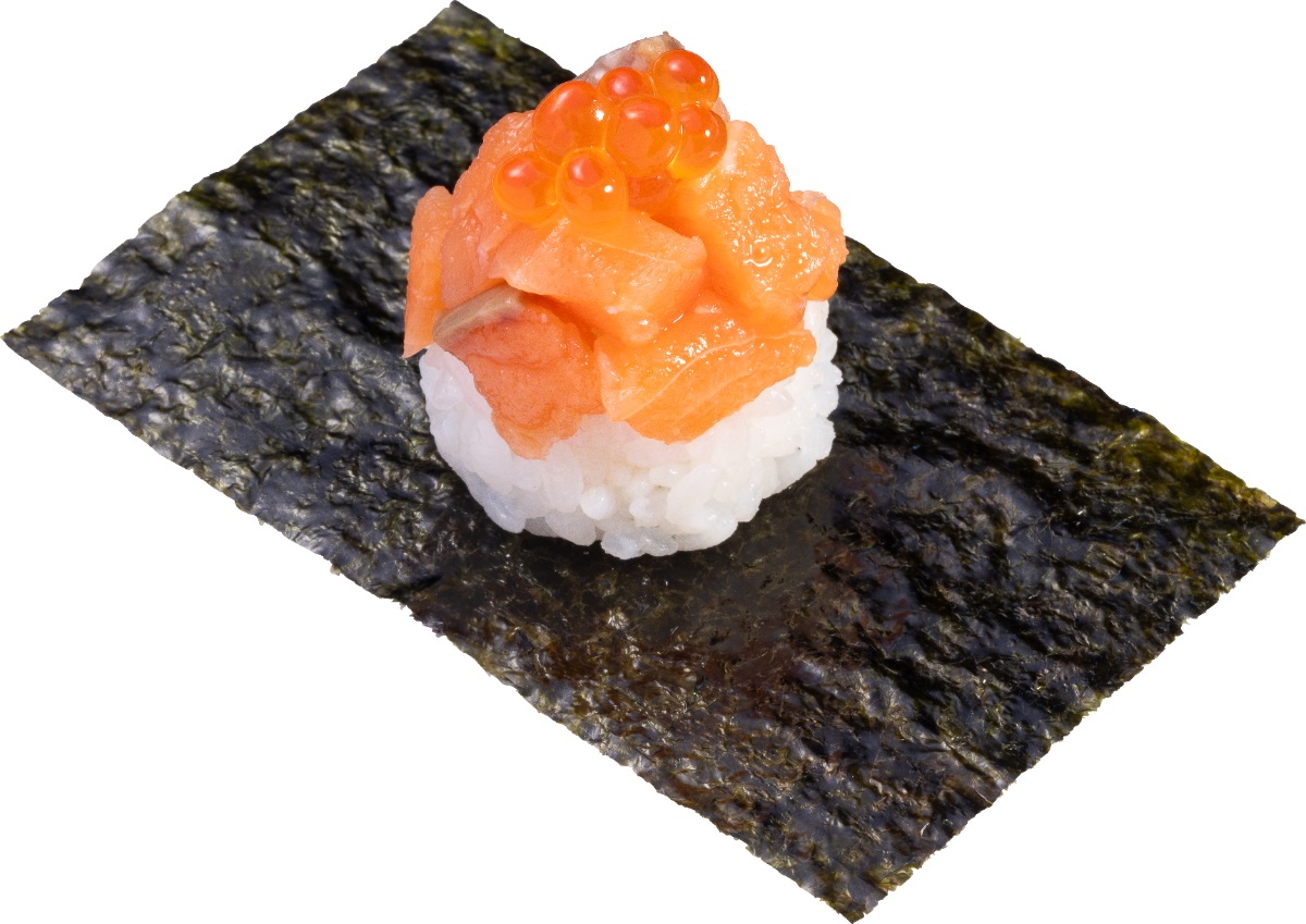 ※「北海道産 サクラマス」「北海道産 サクラマスたたきの親子包み」「活〆真鯛 柚子塩仕立て」「甲いかいくらのせ」は一皿一貫、 そのほかの商品は一皿二貫100円(税込110円)です
