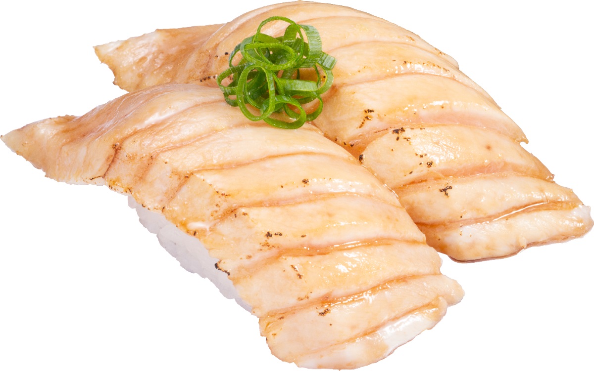 直火で炙って風味よく仕上げた「大切りびん長まぐろはらみ焦がし醬油炙り」