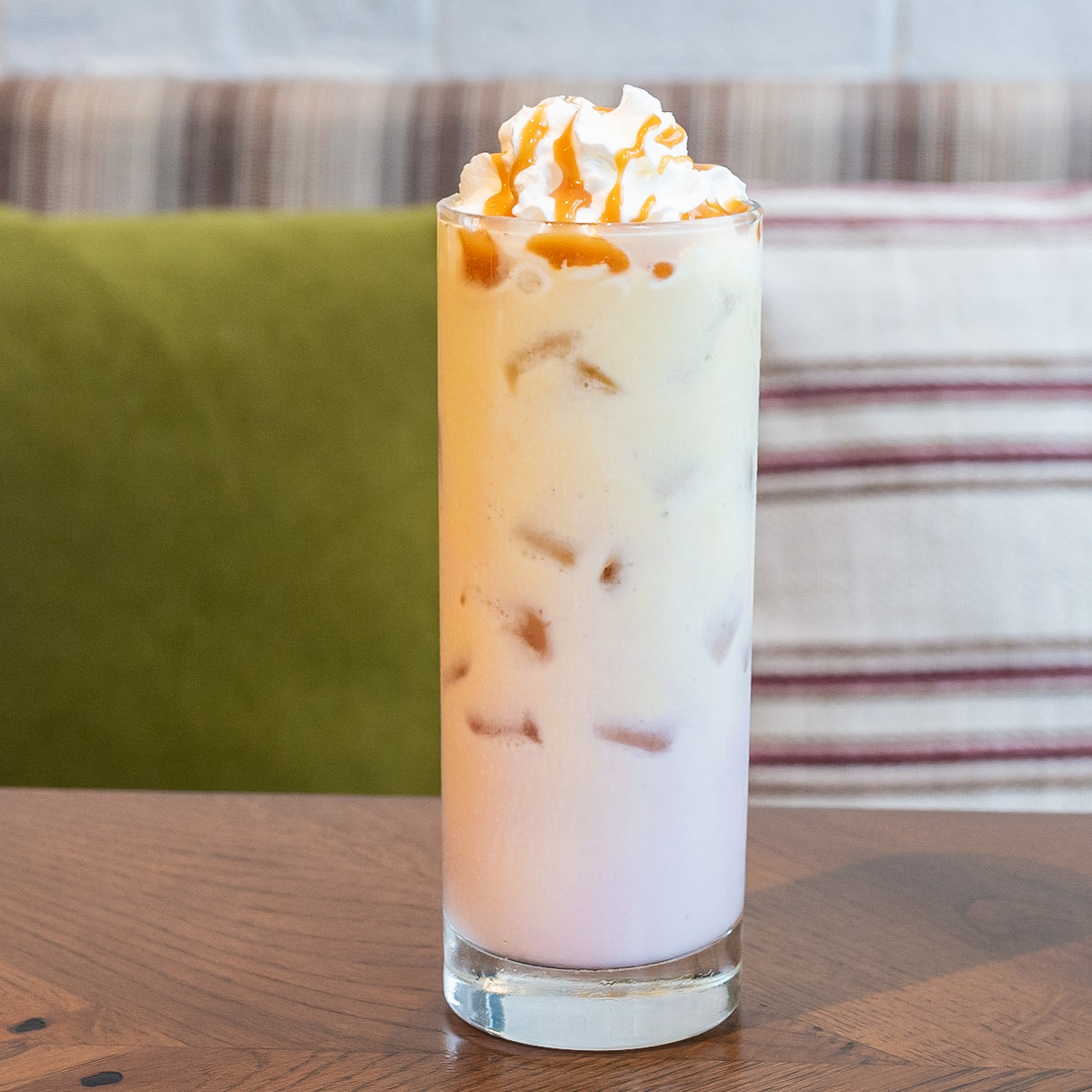 キャラメルソースとホイップクリームをトッピングした、見た目もかわいいドリンクです。