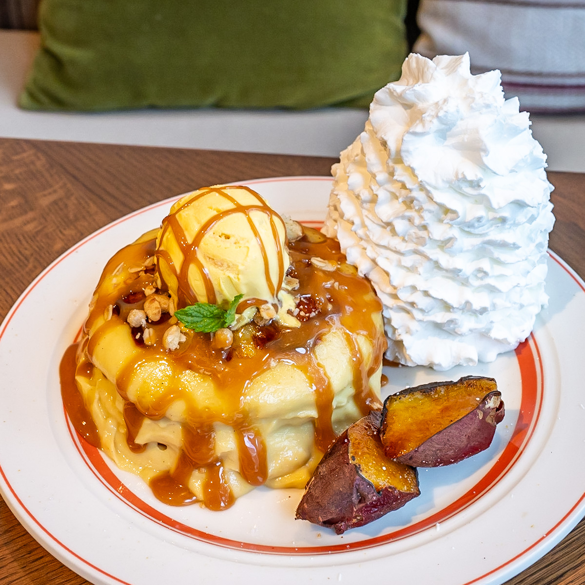 秋ならではの焼き芋とさつまいもアイスが添えられた、濃厚な味わいのパンケーキです。