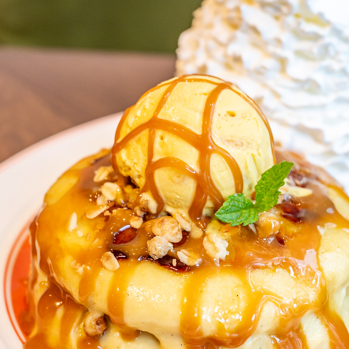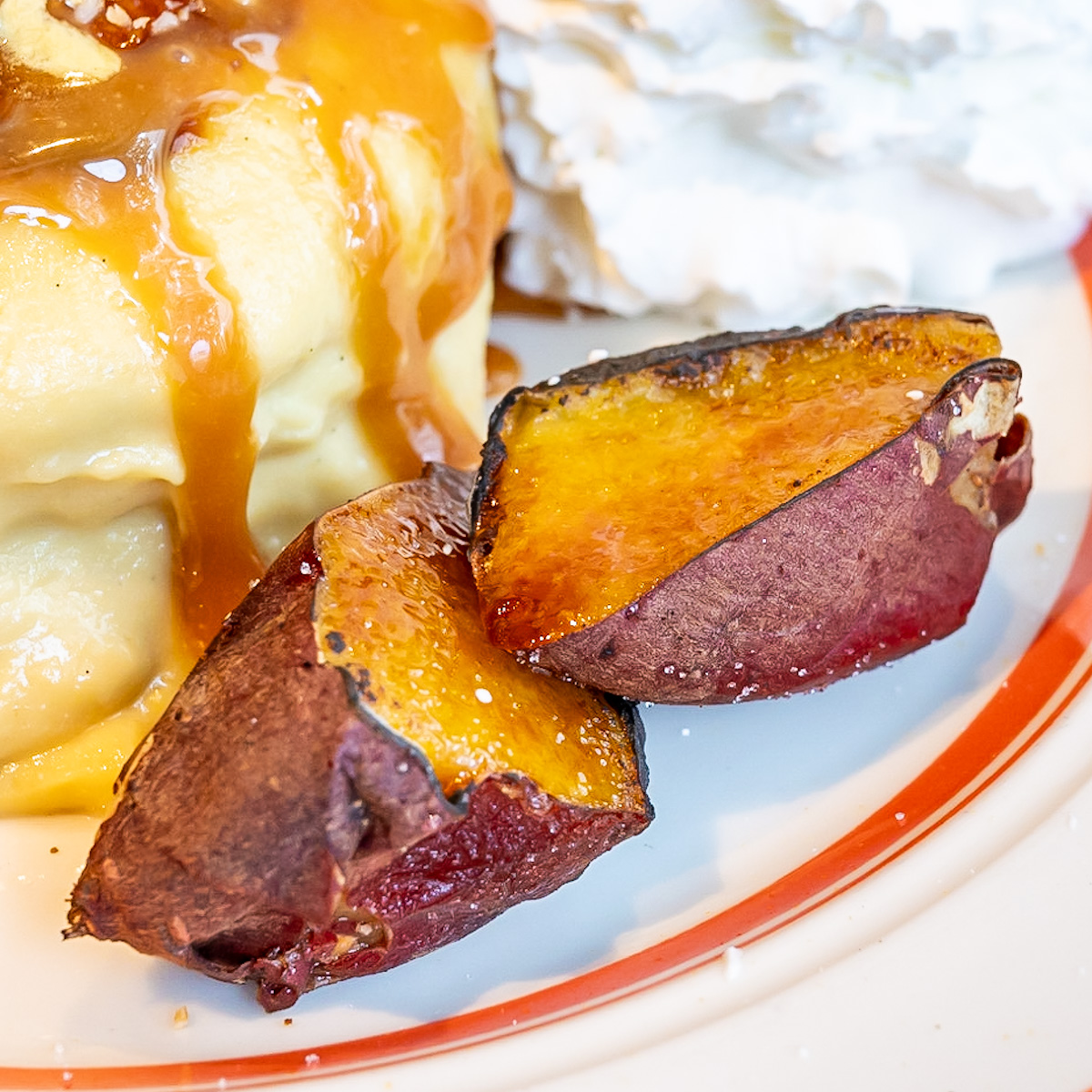 ブリュレしてパリッと仕上げたスイートポテトクリームにキャラメルソースをたっぷりかけ、仕上げにさつまいもアイスをトッピング。