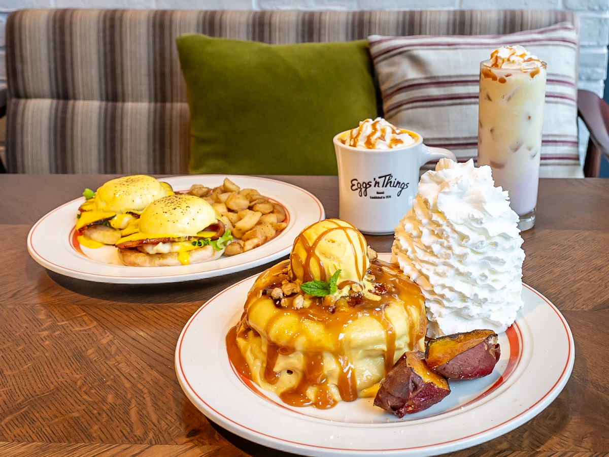 Eggs ’n Things「スイートポテトと焼き芋のパンケーキ」「メープルベーコンのエグスンベネディクト」