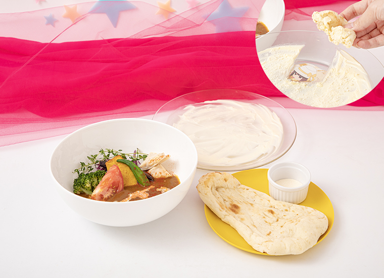 プレートのクリームチーズにチーズパウダーをふりかけてナンをつけると、「有馬かな」が現れます☆