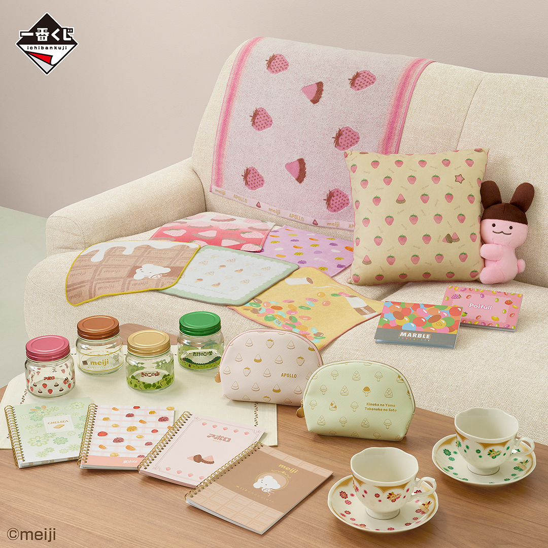 「meiji」の人気お菓子をモチーフにしたクッションやティーカップ&ソーサーなどの日常雑貨が、全6等級20種+ラストワン賞で登場。