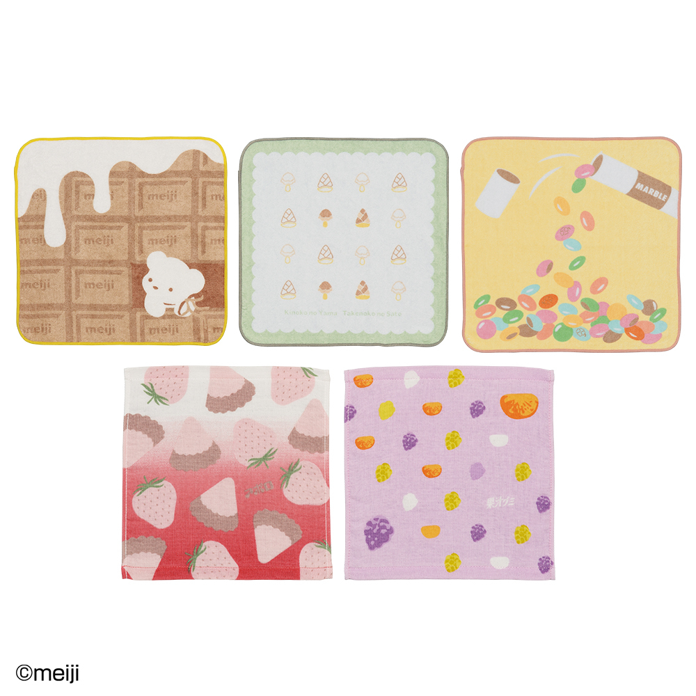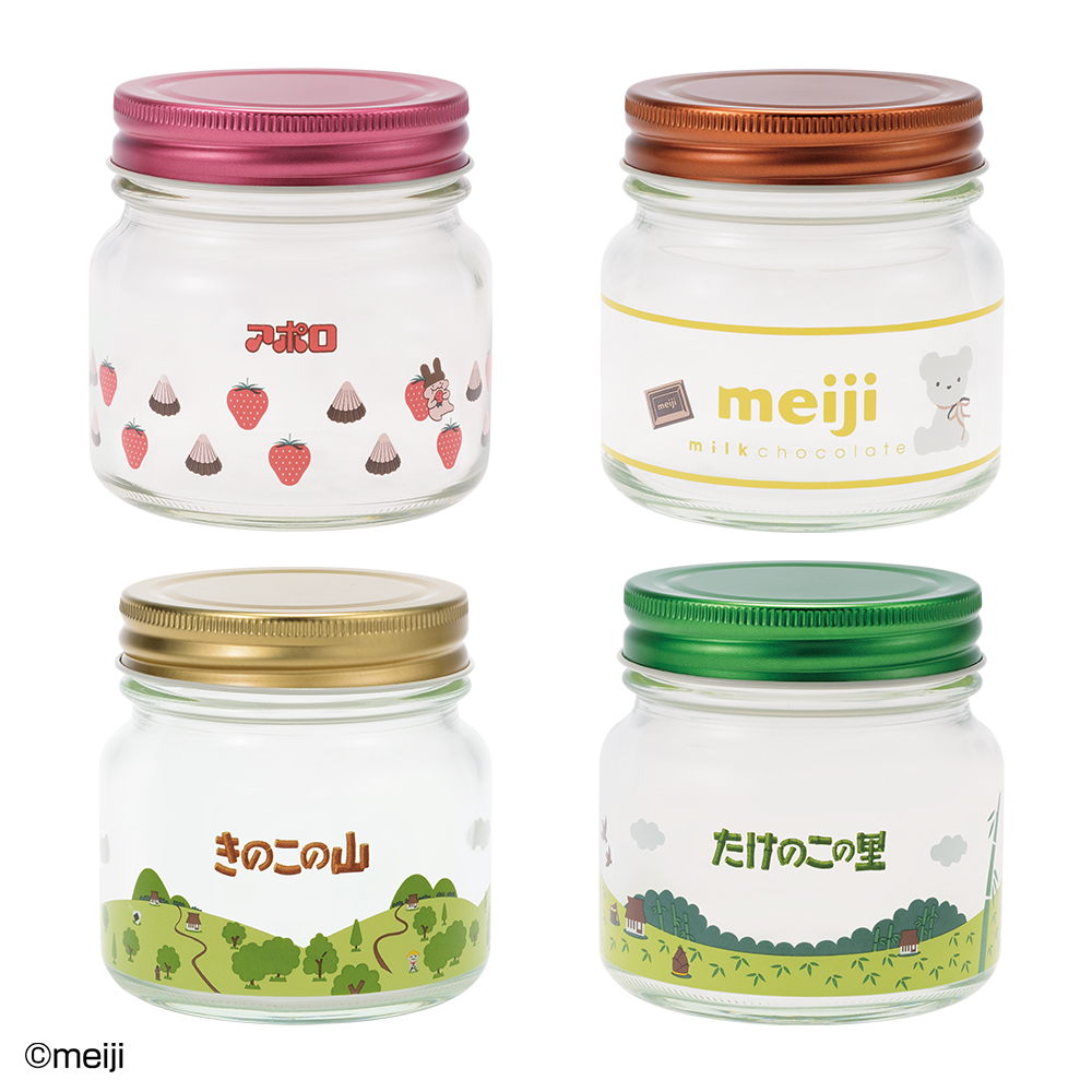 「アポロ」「meiji ミルクチョコレート」「きのこの山」「たけのこの里」の4柄です。