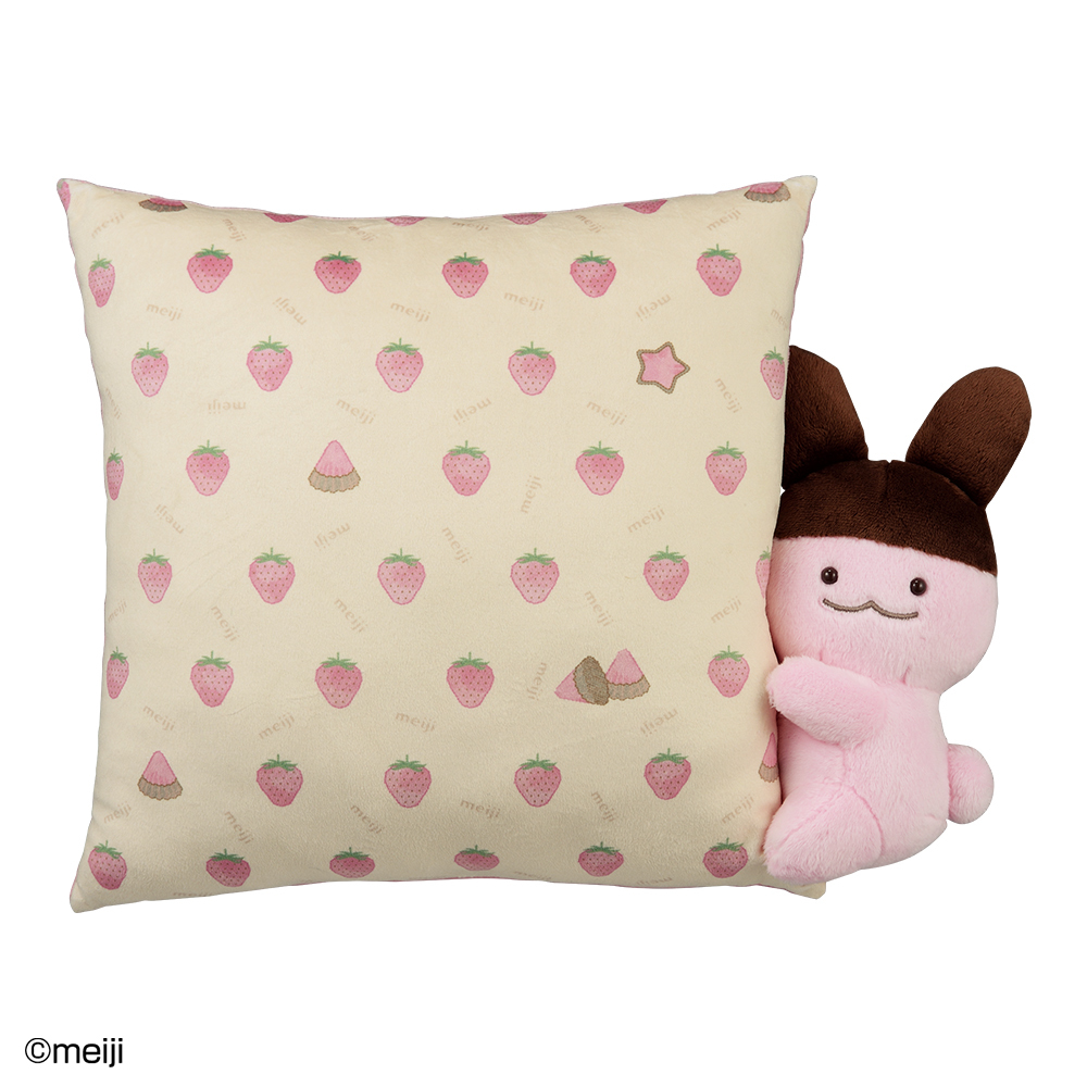 クッションの表面は「アポロ」とイチゴ柄、裏面は落ち着いたピンク色です。