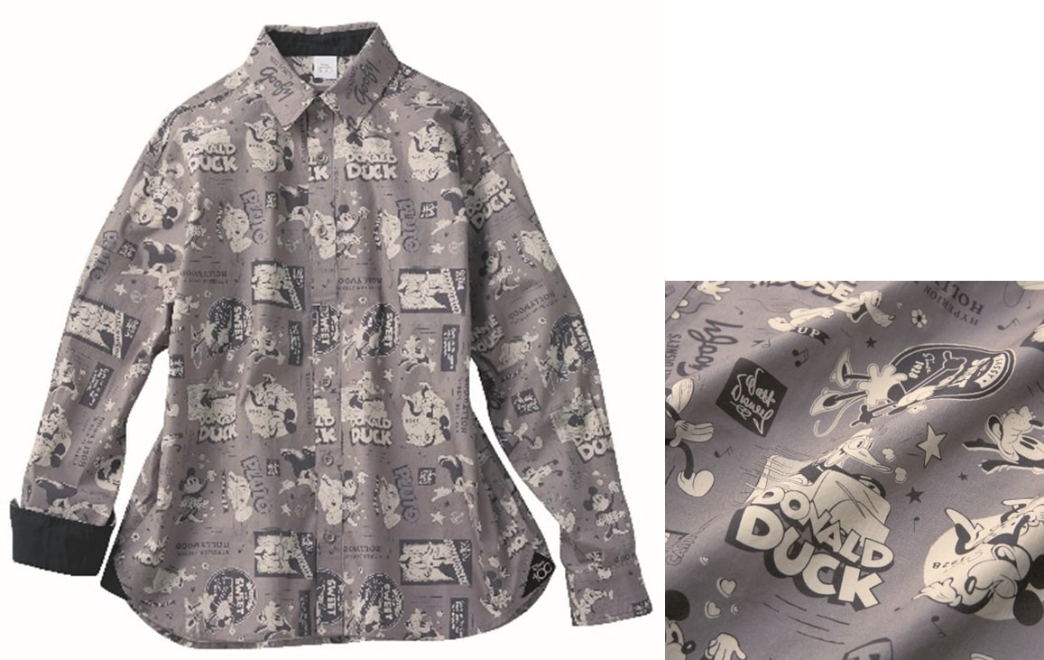 クラシカルな「ミッキーマウス」たちのアートを使った総柄デザインのシャツ。