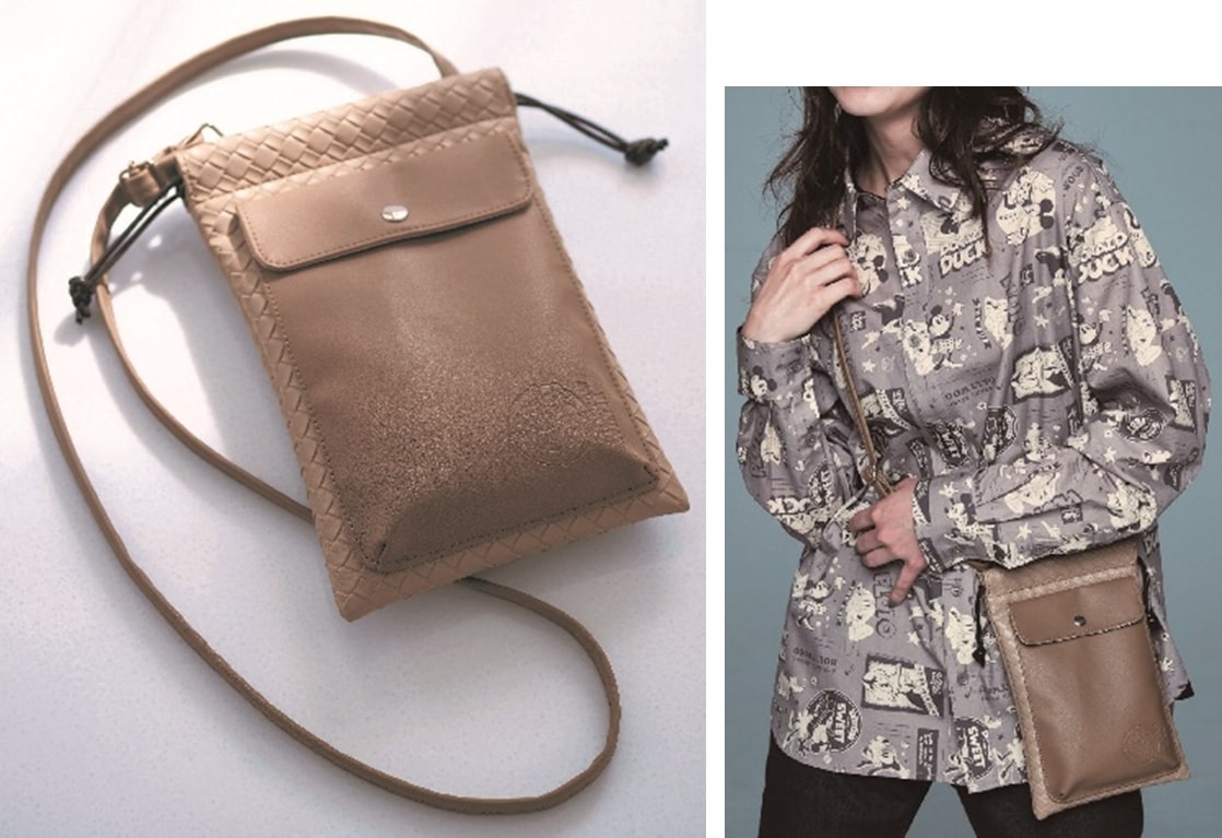 「ディズニー100」を記念したヴィンテージライクなデザインの、スマートフォン収納ショルダーバッグ。