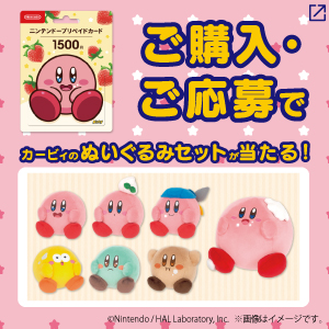 『カービィ』オリジナルニンテンドープリペイドカードを購入し、特設サイトから応募すると、抽選で50名に「カービィのぬいぐるみ7種セット」が当たります。