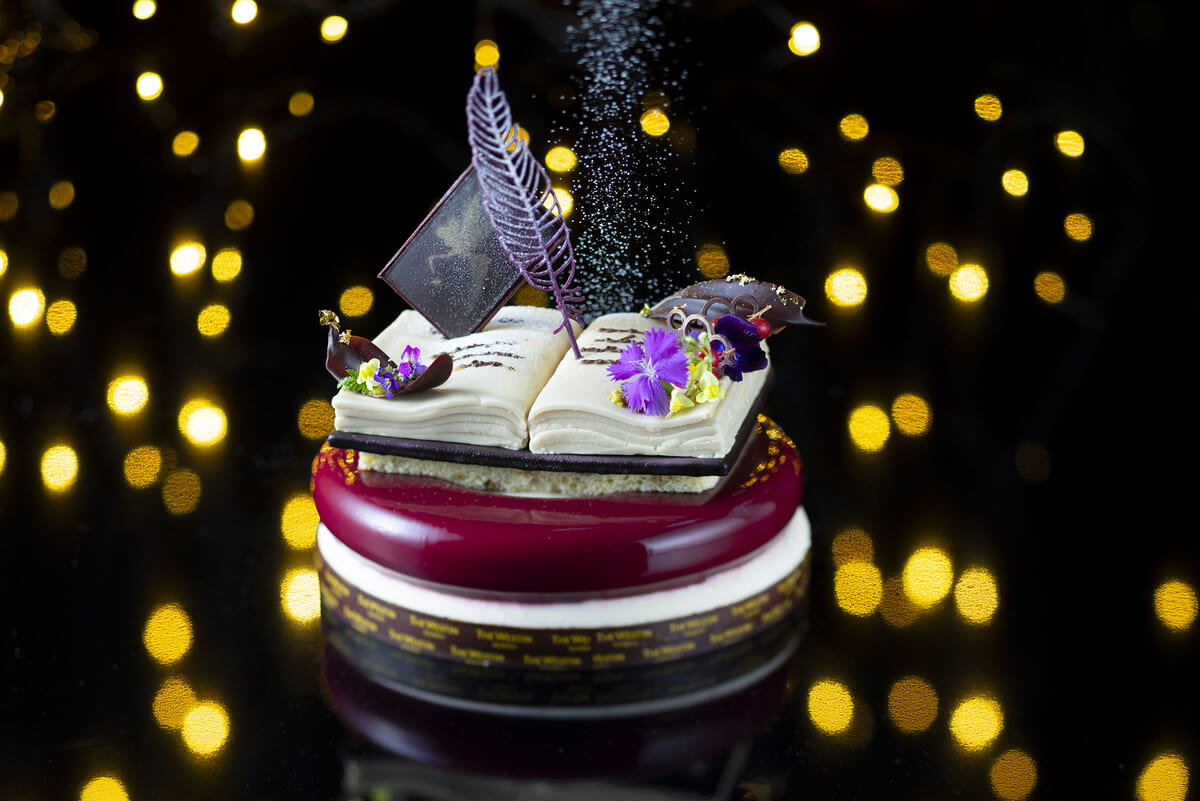 カスタードクリームとメレンゲを合わせた、洋なしのシブーストを洋書に見立てトップにあしらい、クリスマスらしさを演出。