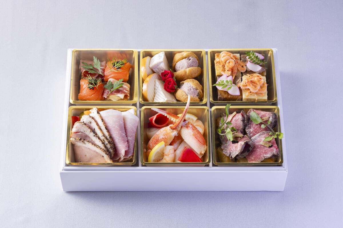 「オードブルボックス」は、蟹のシーフードマリネなどの6品で、クリスマスらしい贅沢な料理堪能。