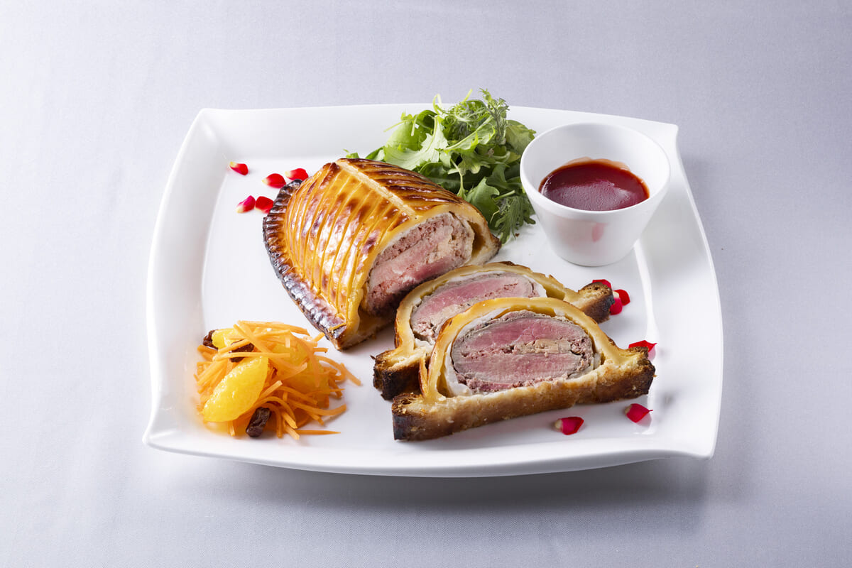 濃厚でクリーミーなフォアグラを鴨胸肉で包み、オレンジピールを混ぜ合わせたパテとともに、 パイ生地で包んで焼き上げた一品。