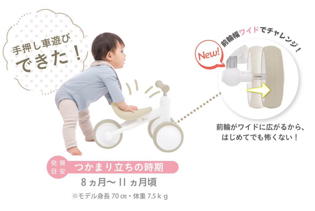 つかまりたちの時期は、前輪幅をワイドにして、つかまり立ちにチャレンジ!