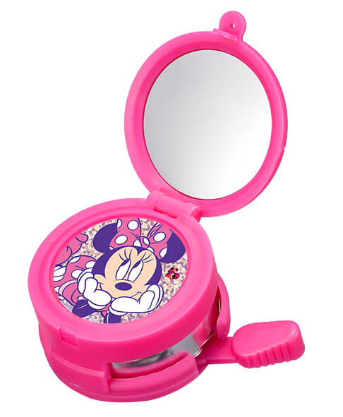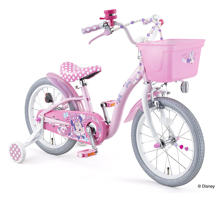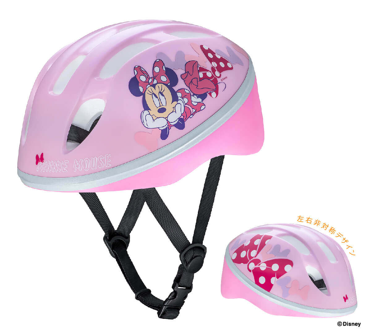 「ミニーマウス」デザインの自転車とキッズヘルメット。