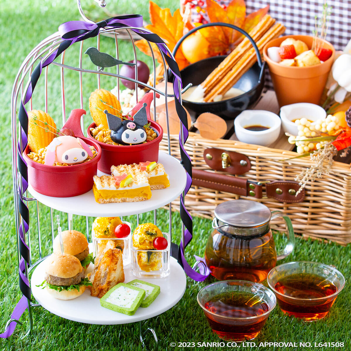 お庭でのハロウィーンパーティをイメージした、サンリオキャラクターたちと楽しむ10月限定のアフタヌーンティー。