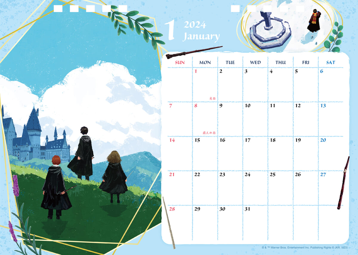 2024年1月は「ハリー・ポッター」「ロン・ウィーズリー」「ハーマイオニー・グレンジャー」の仲良しな3人の後ろ姿が描かれたイラスト。