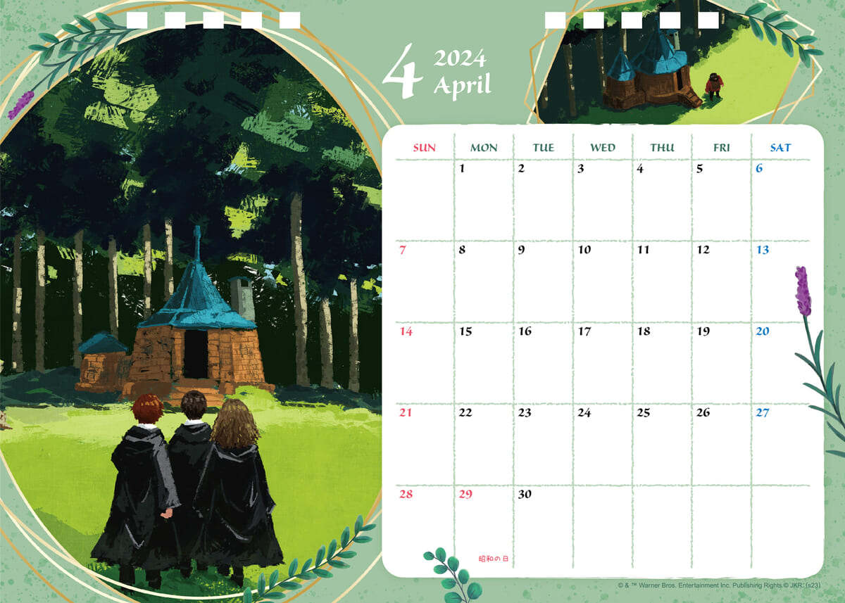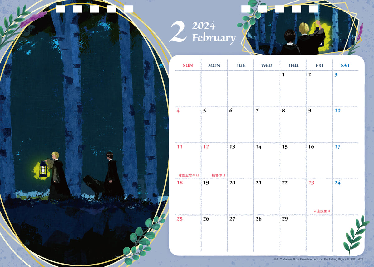 2024年2月は森の中を歩く「ドラコ・マルフォイ」と「ハリー・ポッター」のイラストが使用されています。