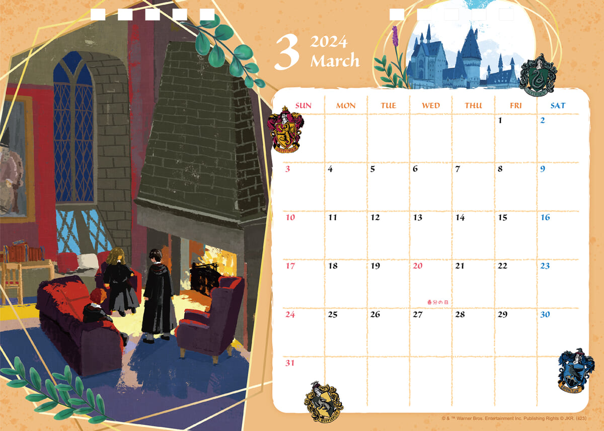 2024年3月は暖炉を囲む「ハリー・ポッター」「ロン・ウィーズリー」「ハーマイオニー・グレンジャー」の温かみのあるデザイン。