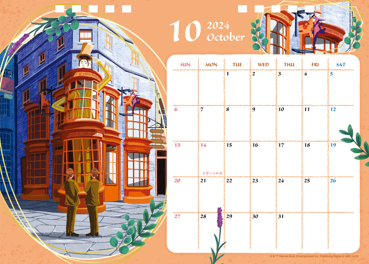 2024年10月は、ウィーズリー家の双子の兄弟「フレッド」と「ジョージ」が立ち上げた悪戯専門店「ウィーズリー・ウィザード・ウィーズ」が描かれています。