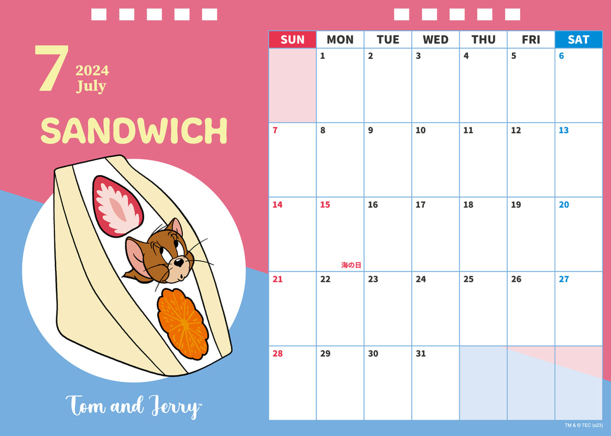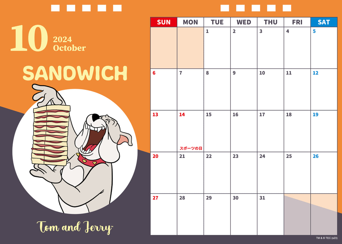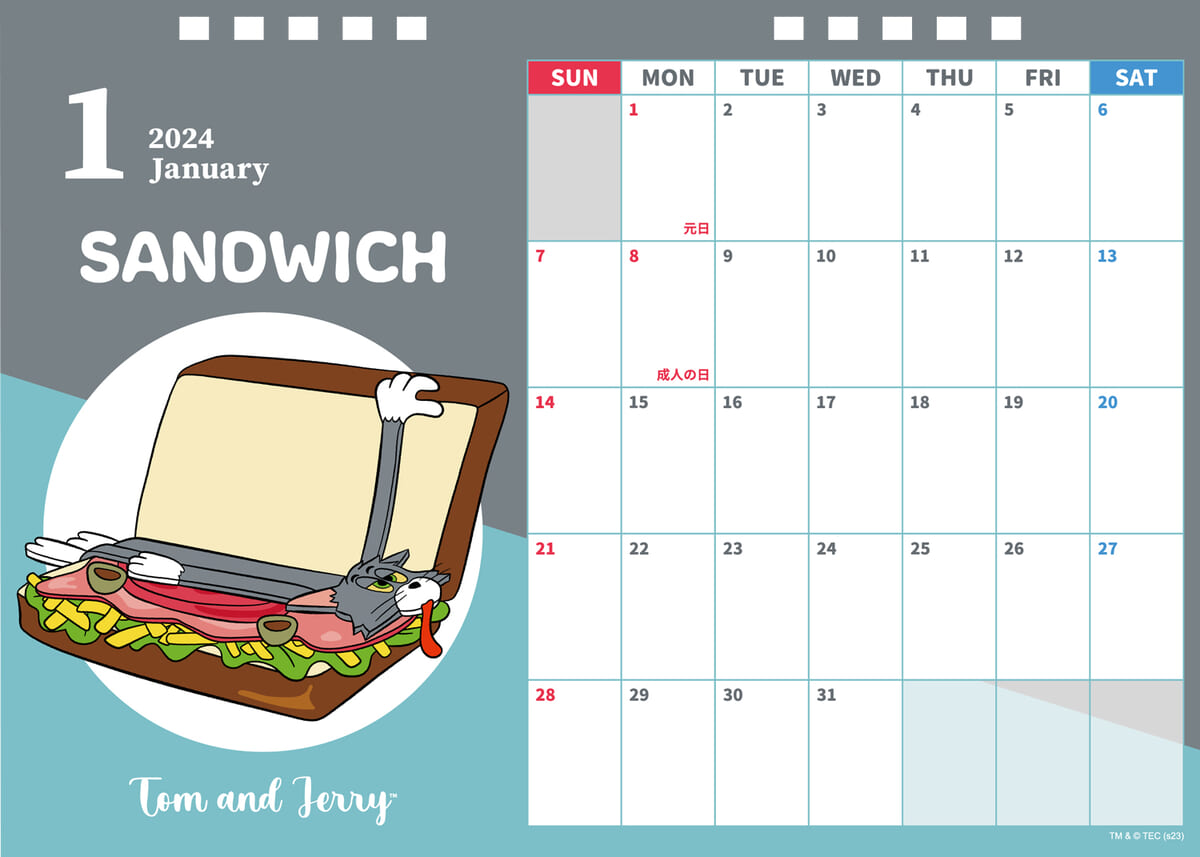 2024年1月のカレンダーには、大きなサンドイッチに挟まり、体がぺしゃんこになった「トム」をプリント。