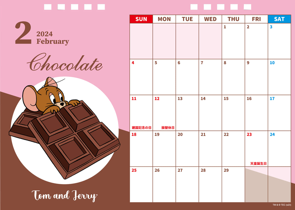 チョコレートからひょっこりお顔を出す「ジェリー」を描いた2月のカレンダー。