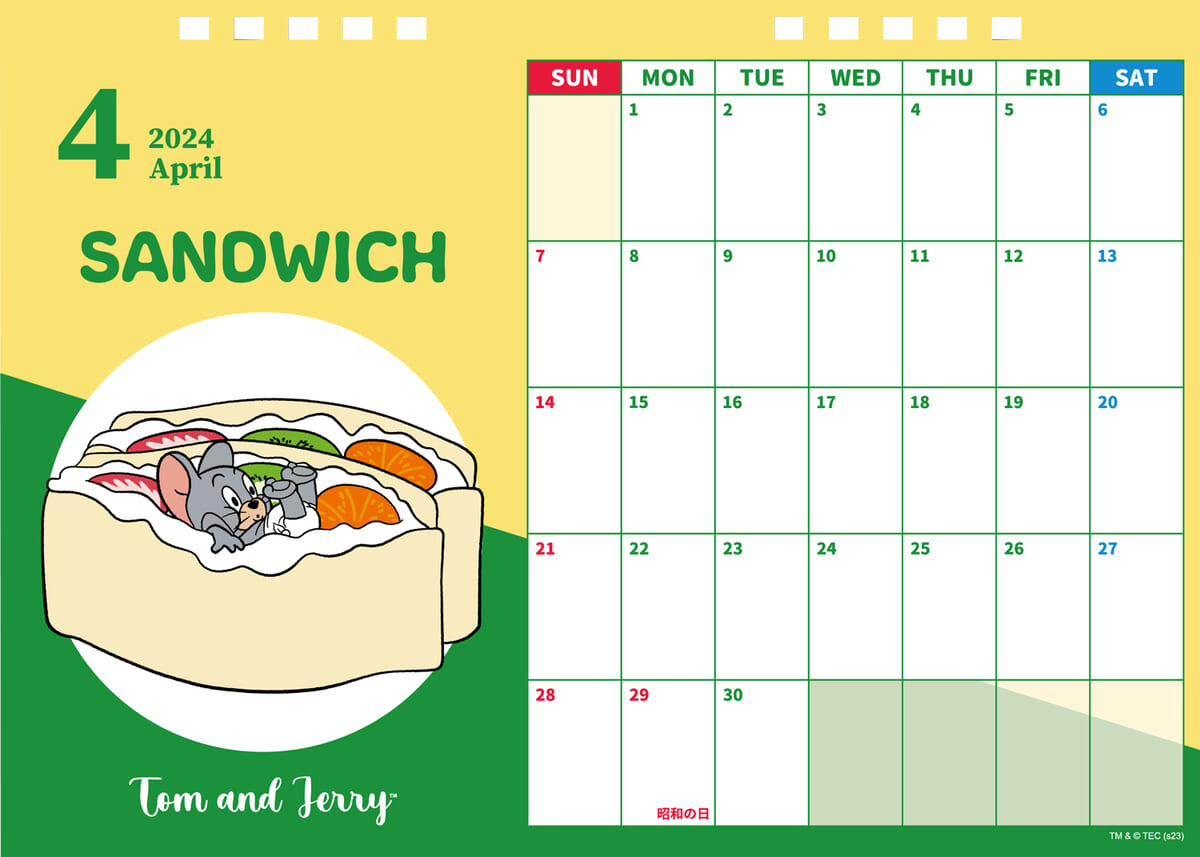 「トム」と「ジェリー」のドタバタコンビをサンドイッチやスイーツと共に描いた、月替わりのカレンダーです☆