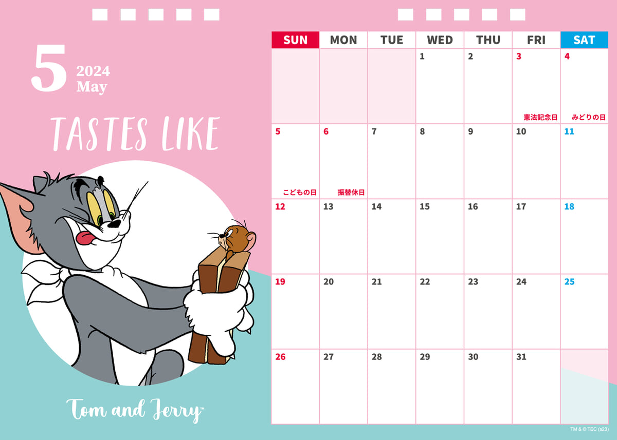 5月のカレンダーには「トム」と「ジェリー」のドタバタコンビをプリント。