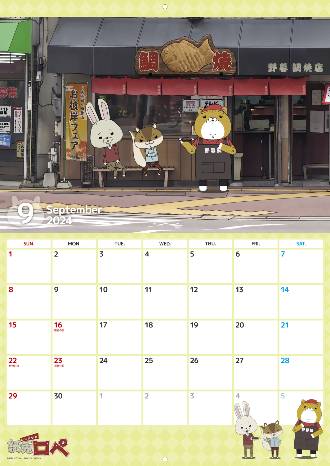 八百屋さんの前に佇む「ロペ」と、椅子に座った「アキラ先輩」が表紙になった壁掛けカレンダー。