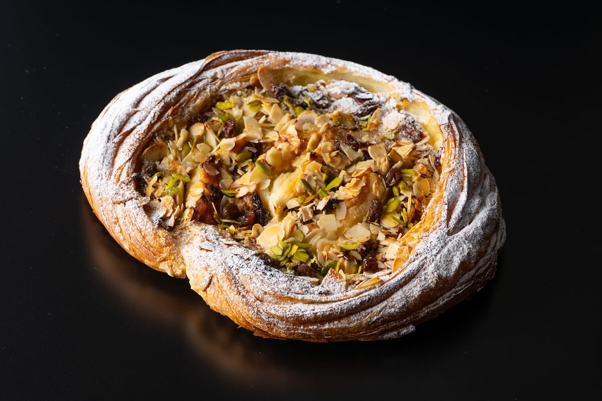 サクサクの生地にカスタードクリーム、ドライレーズンとセミドライアプリコット、ピスタチオをトッピングしています!