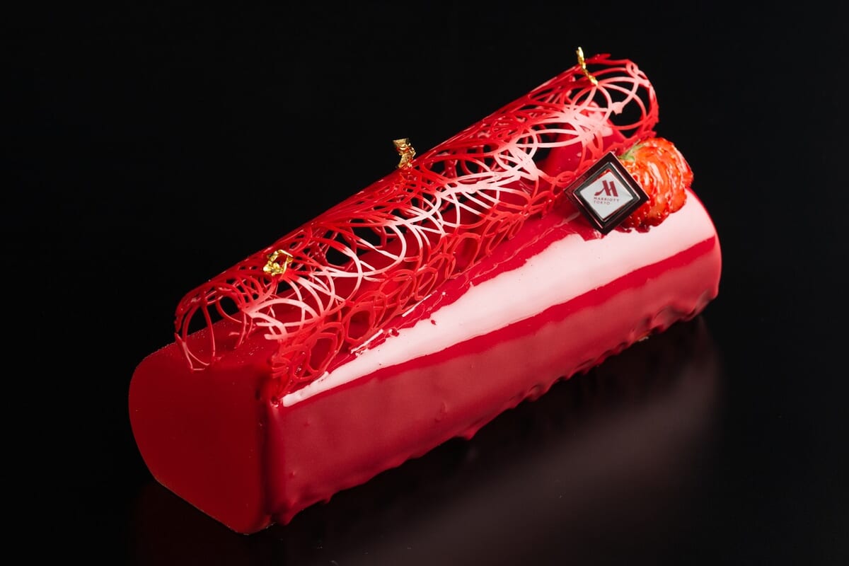 濃厚なピスタチオのブリュレを、バランスの良い甘味と酸味が特長的な、福岡県産苺「あまおう」のムースで閉じ込めた真っ赤なブッシュドノエル。