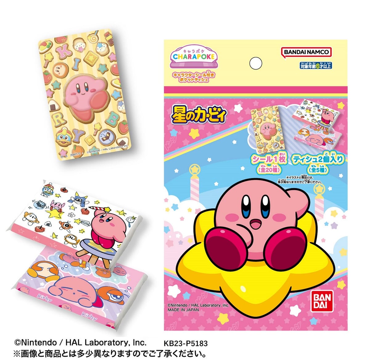様々な「星のカービィ」が描かれたポケットティッシュ2個と、全20種類のシール1枚がセットになっています☆