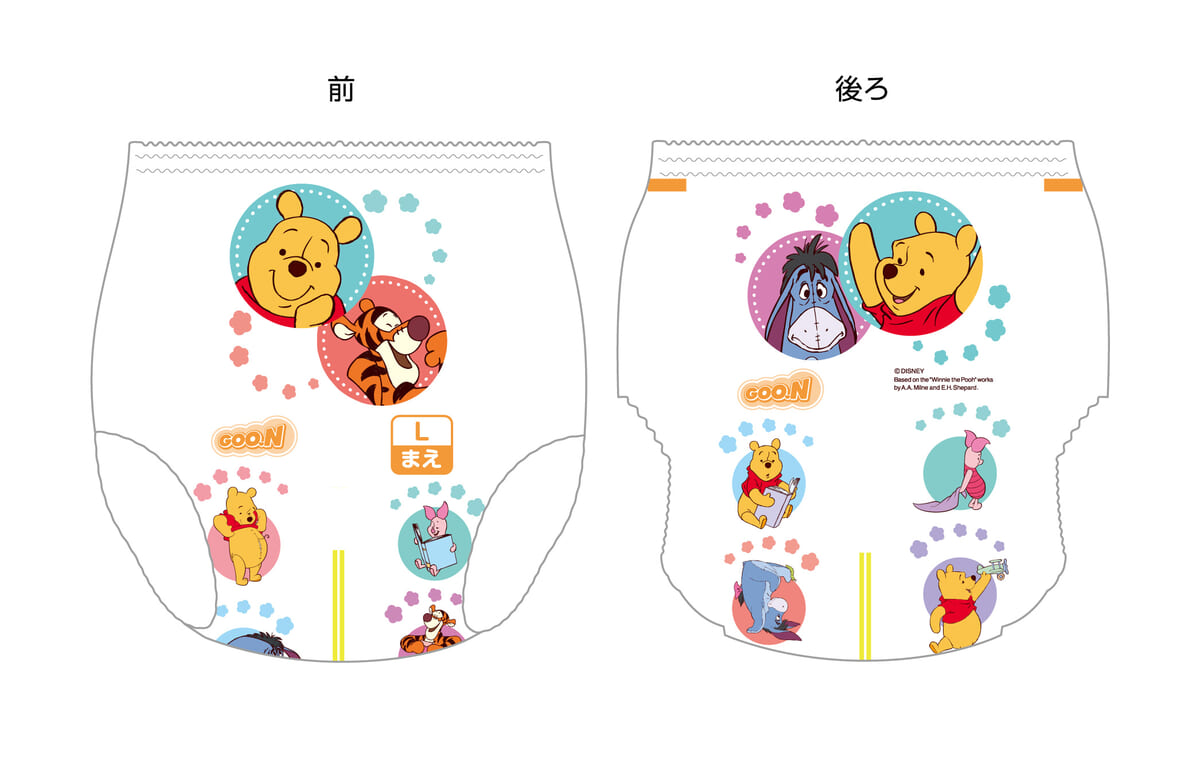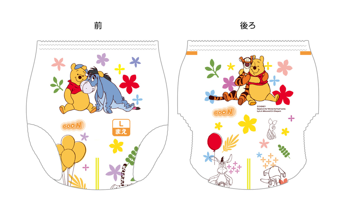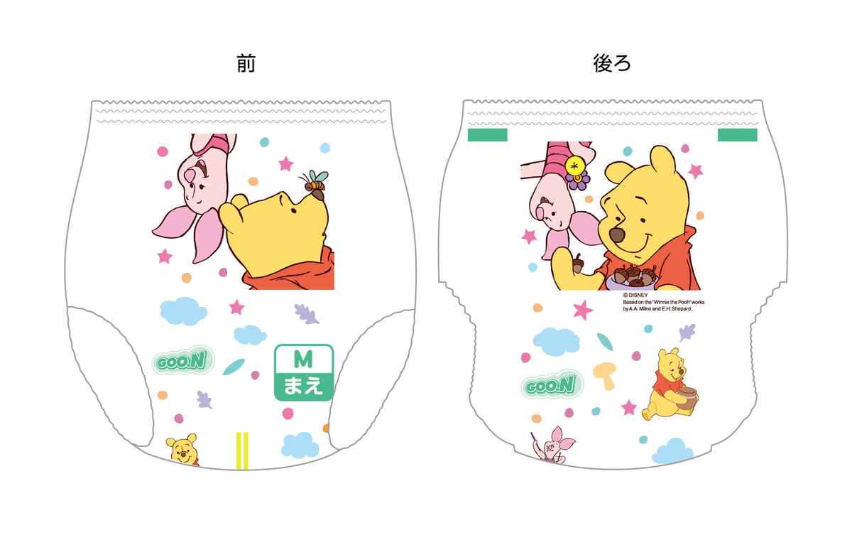 パッケージとおむつ柄には、赤ちゃんからママ・パパまで人気の『くまのプーさん』をM・Lサイズに。