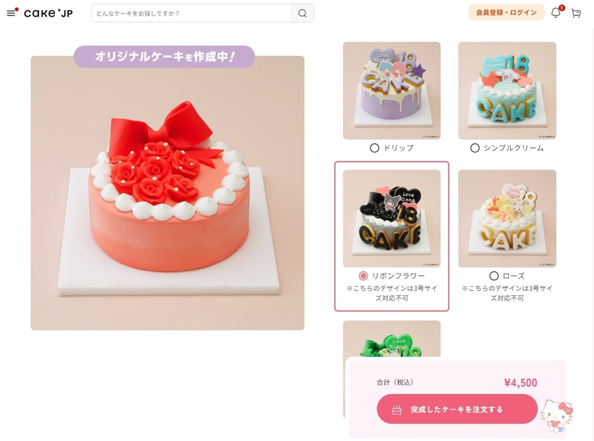 9種類のサンリオキャラクターズをイメージしたプリセットデザインから選んだり、一から自分でデザインやサイズ、色、飾りをカスタマイズしたり、世界に一つだけのケーキがつくれます。