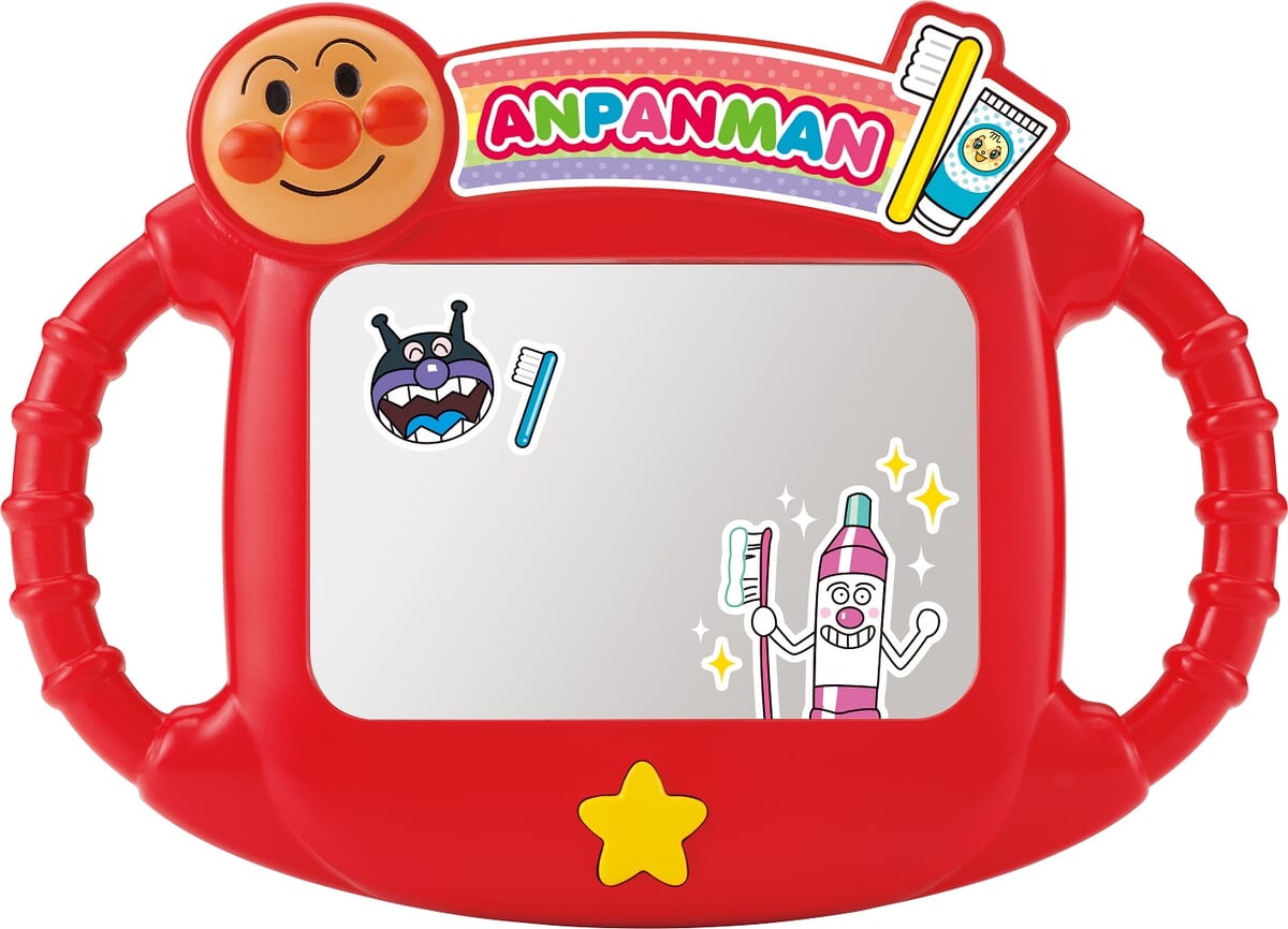 スタートボタンを押すと約60秒間、「アンパンマン」と「ばいきんまん」の応援ボイス、オリジナルの歯みがきソングが流れるミラー型のおもちゃ。