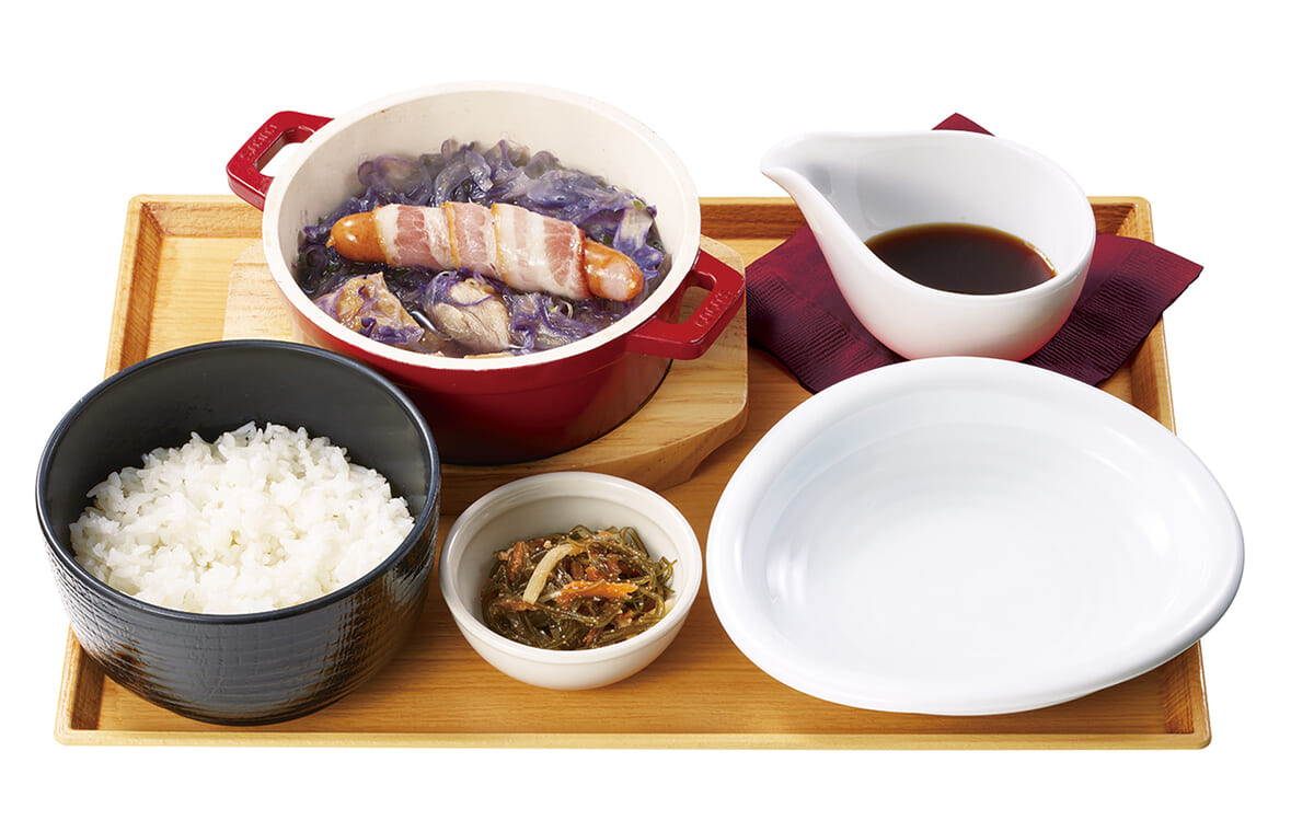 紫キャベツとカラーナフキンで「宿儺」のキャラクターカラーを、うっすら紫色のスープで“呪いの王”らしい邪悪な雰囲気を表現しています。